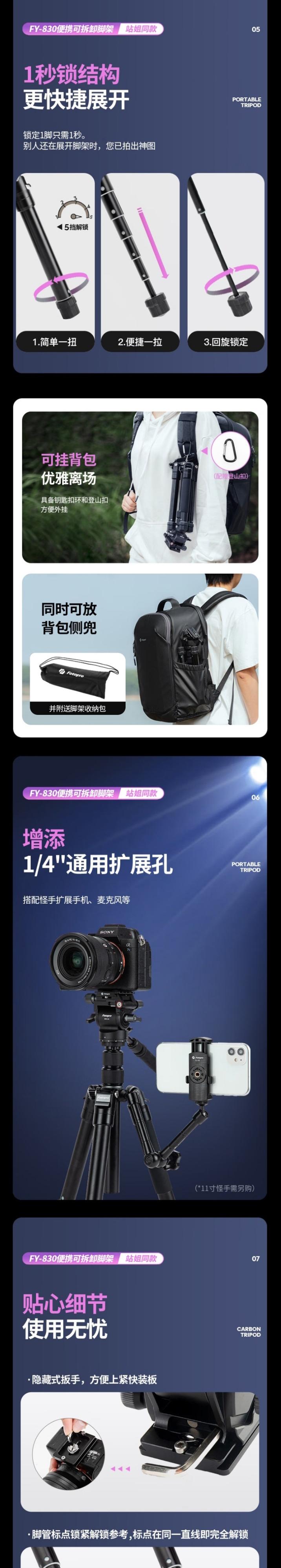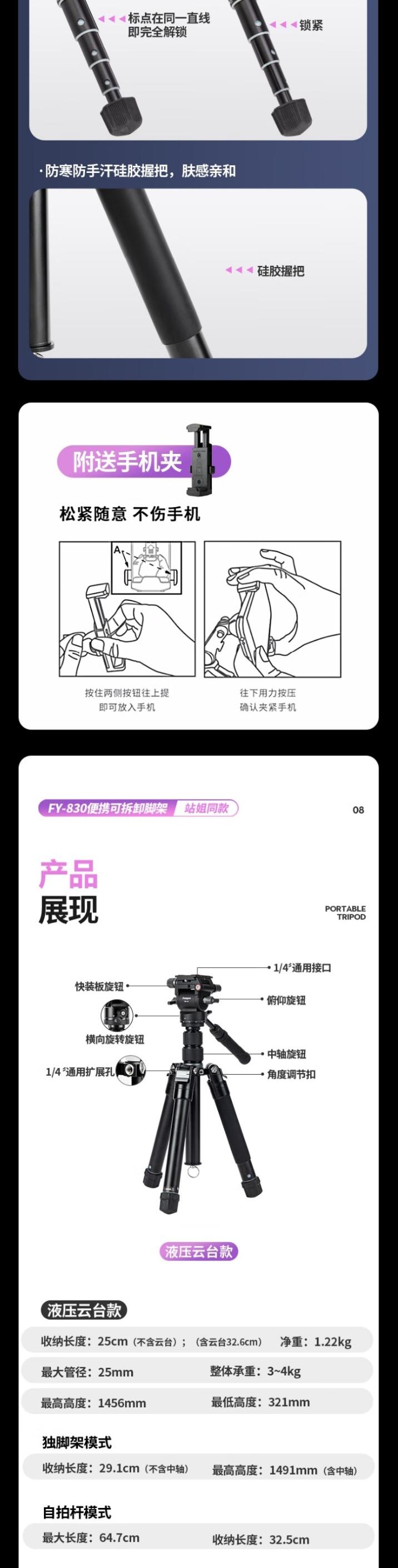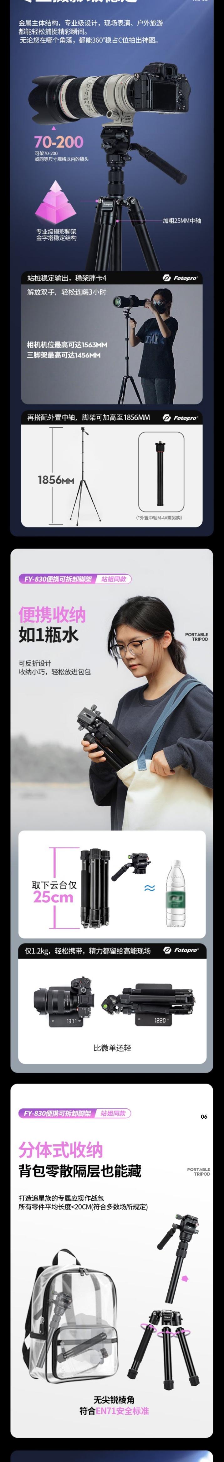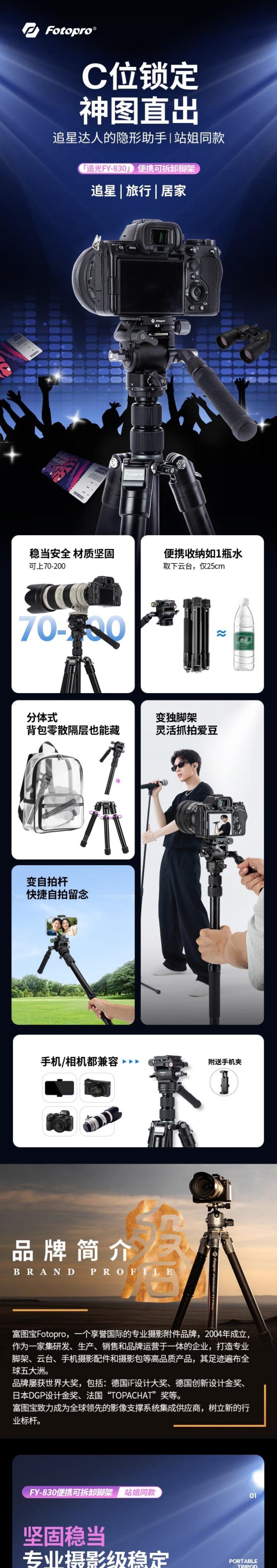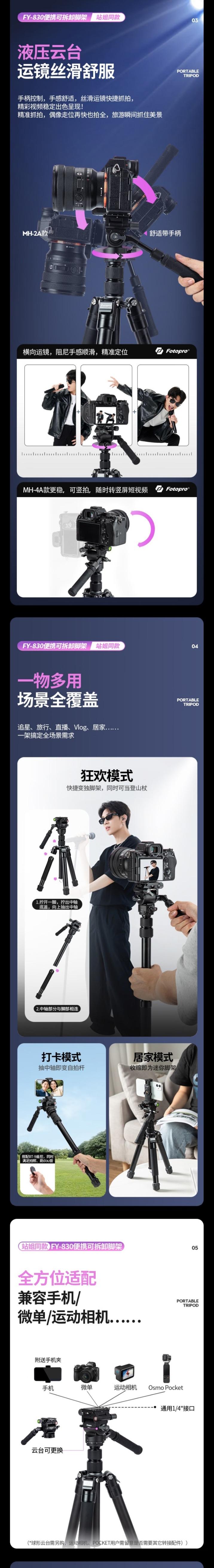 富图宝 FY830+MH-4A 小巧便携拍摄视频演唱会相机三脚架 专业版本