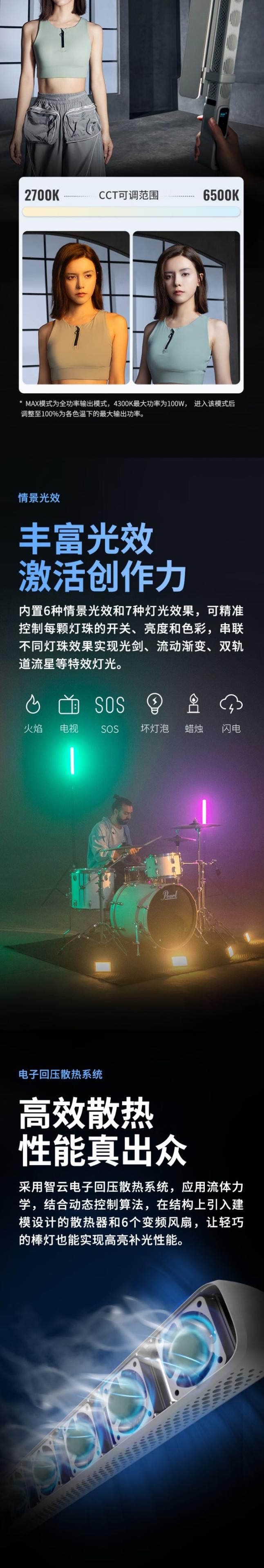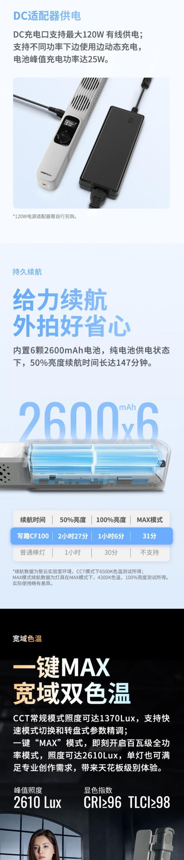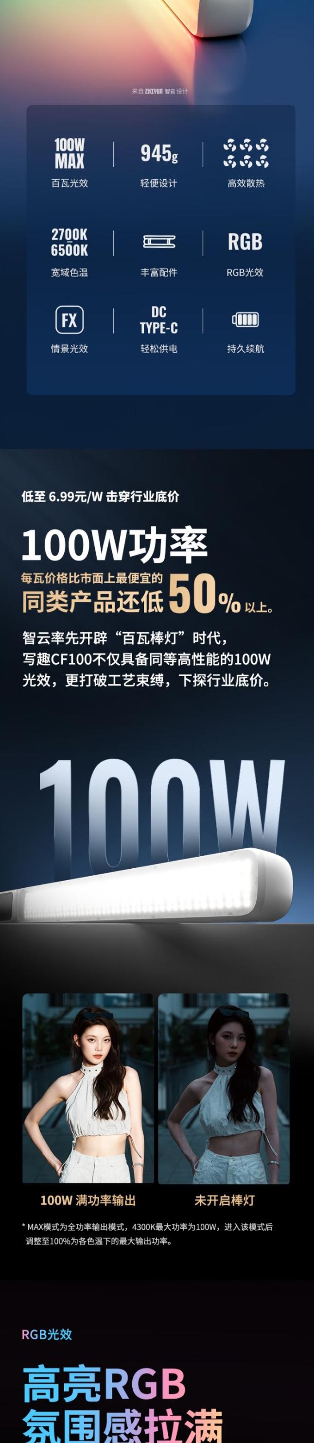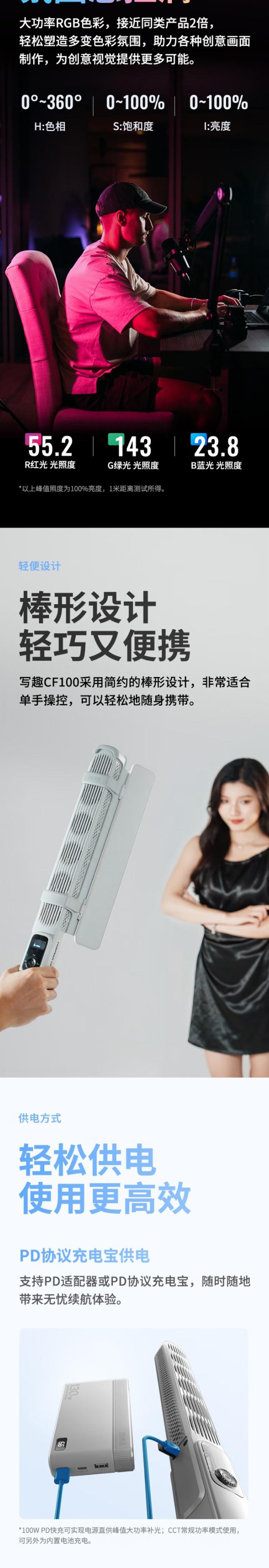 智云 写趣CF100 手持100W专业棒型RGB补光灯